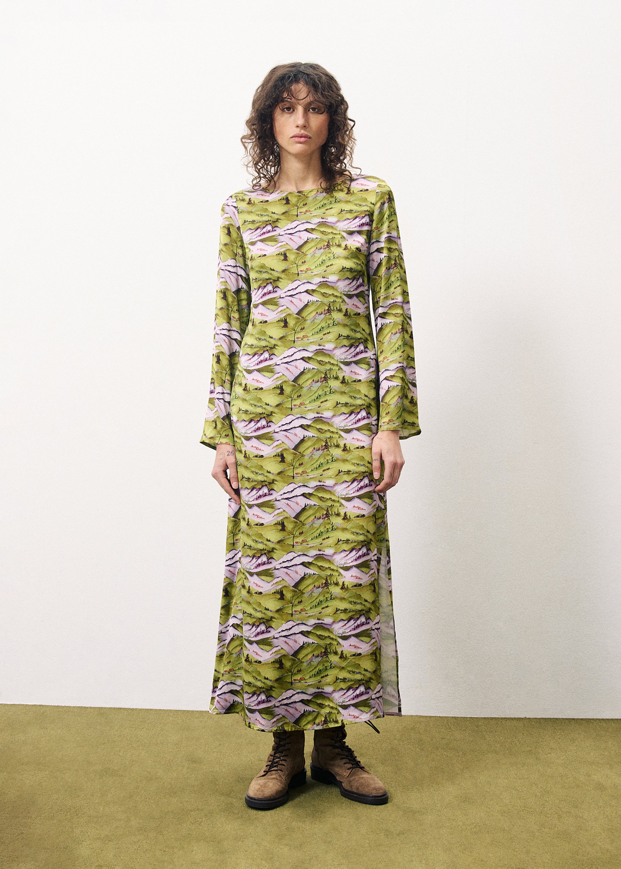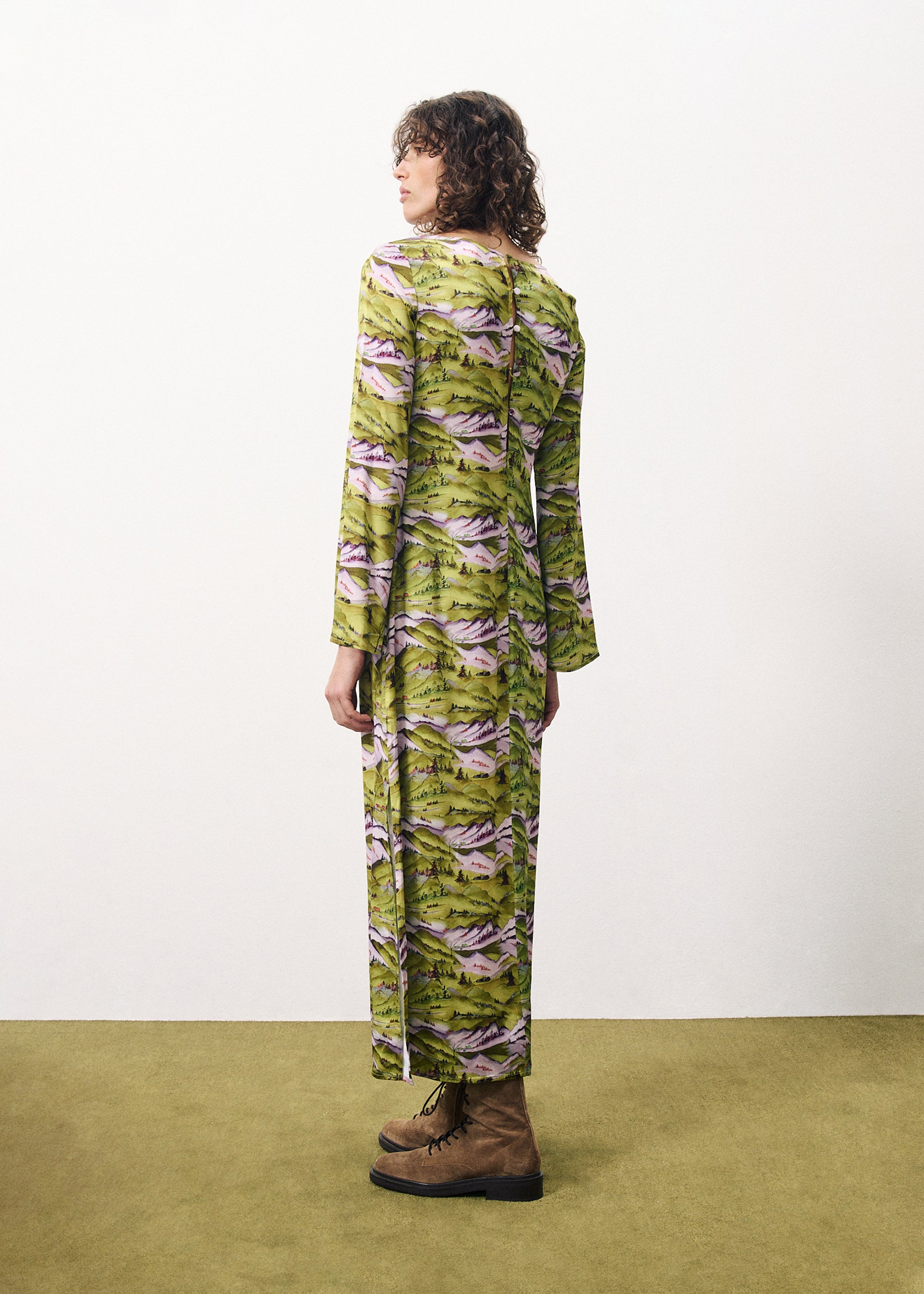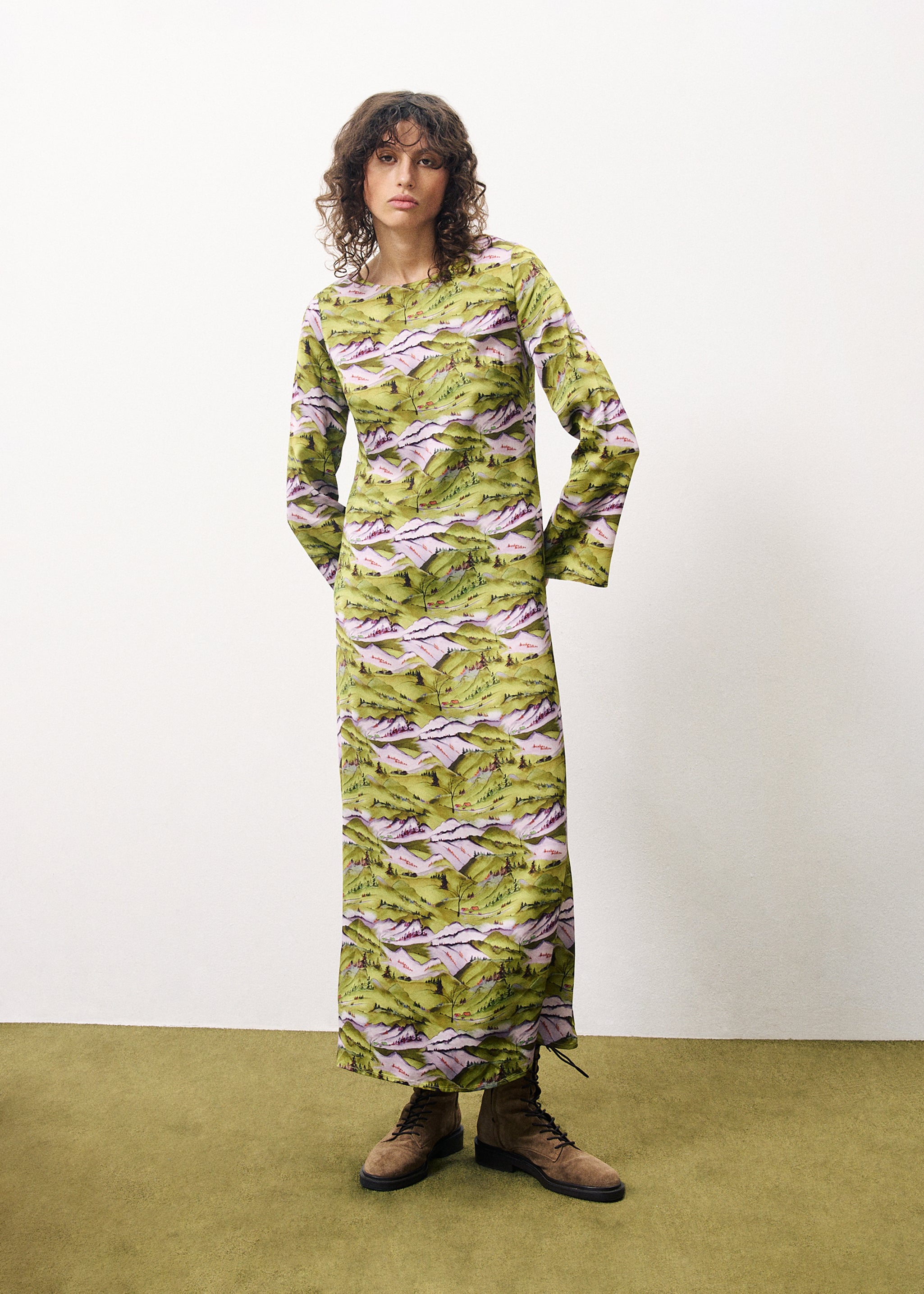 • Bias cut dress • Side slit • Long sleeves • Viscose satin fabric • Exclusive FRNCH print