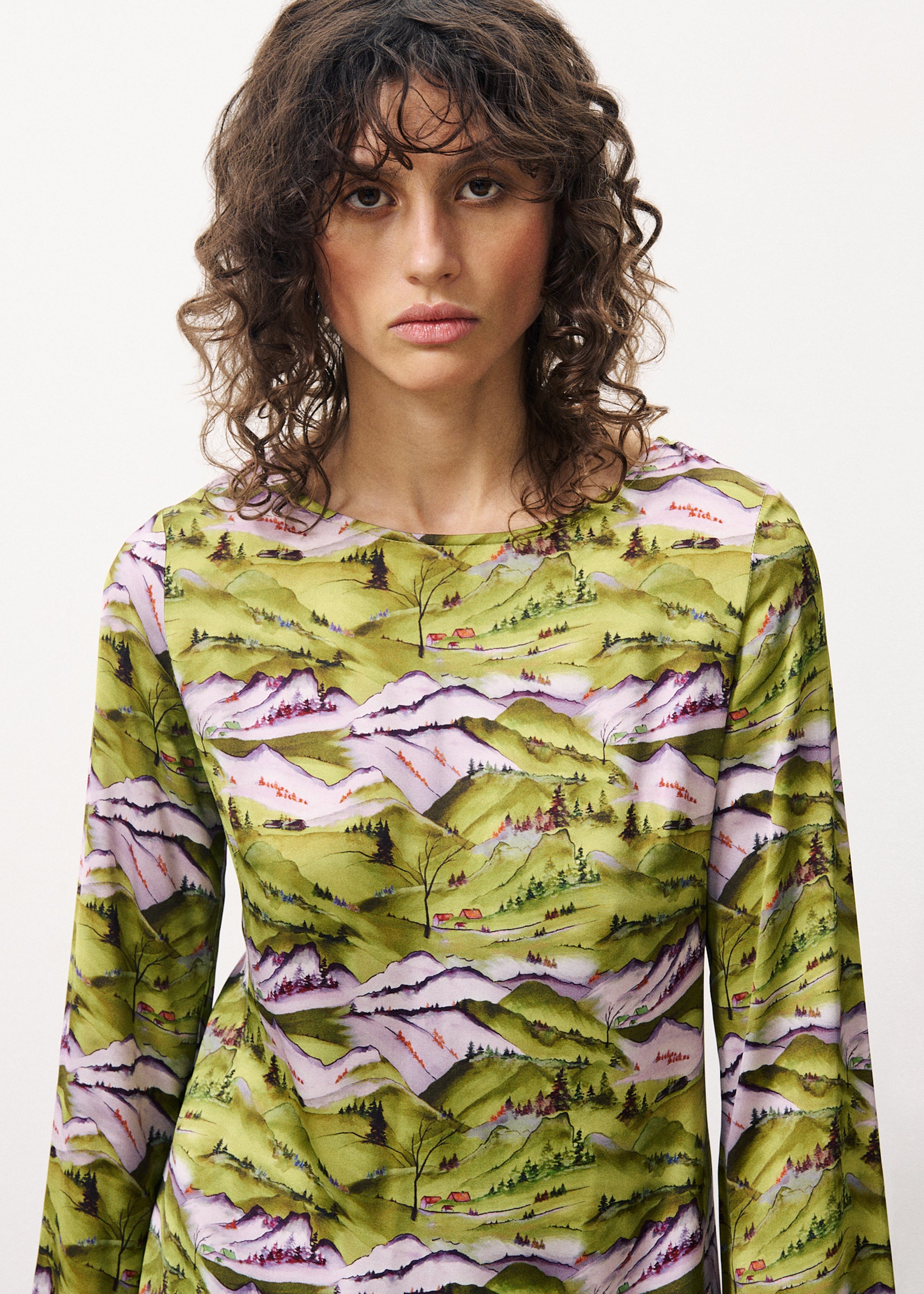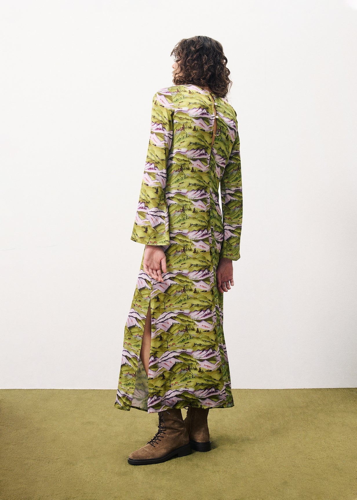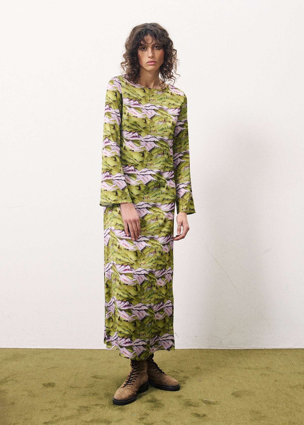 • Bias cut dress • Side slit • Long sleeves • Viscose satin fabric • Exclusive FRNCH print