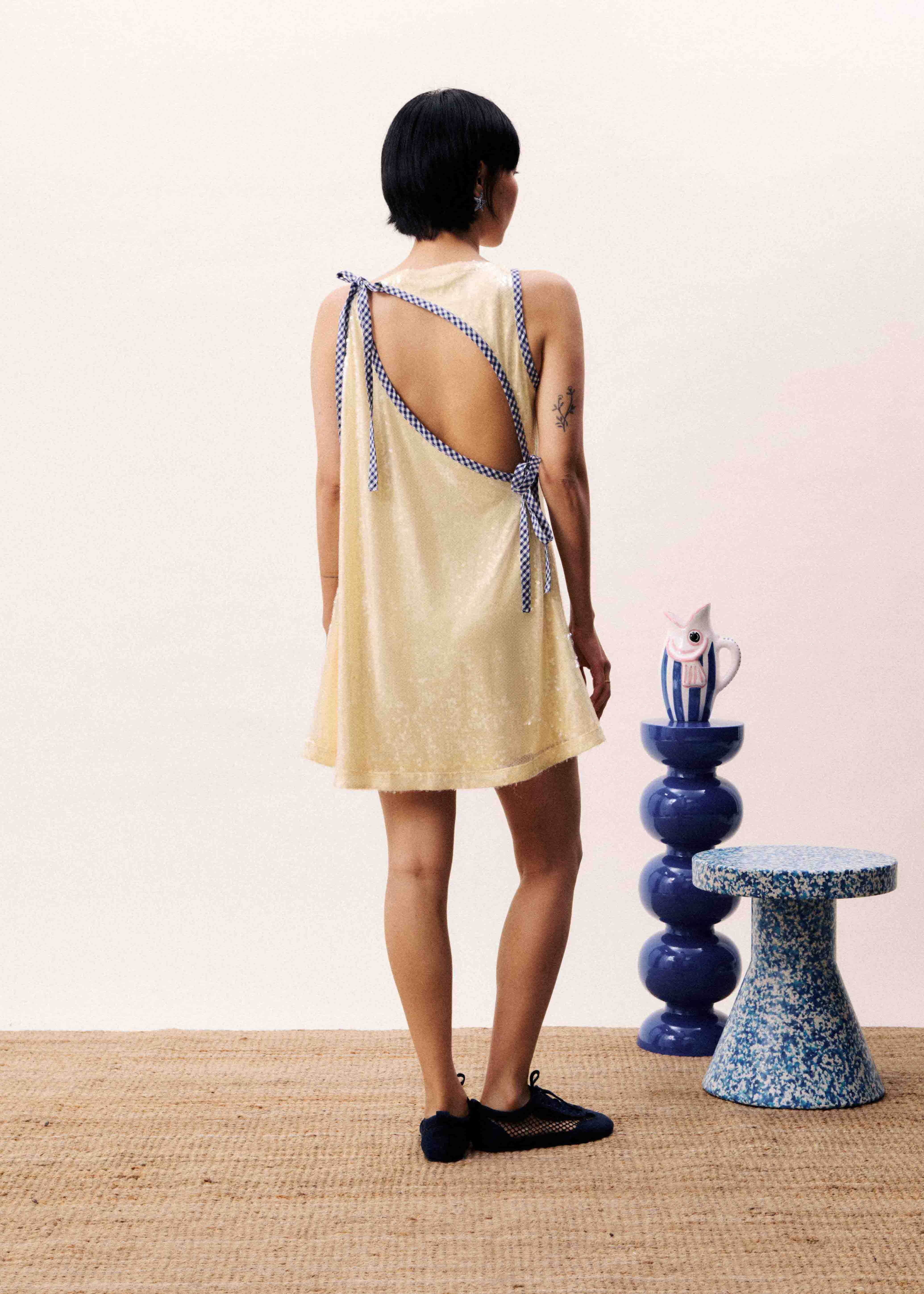 Gold sequined dress with gingham trim