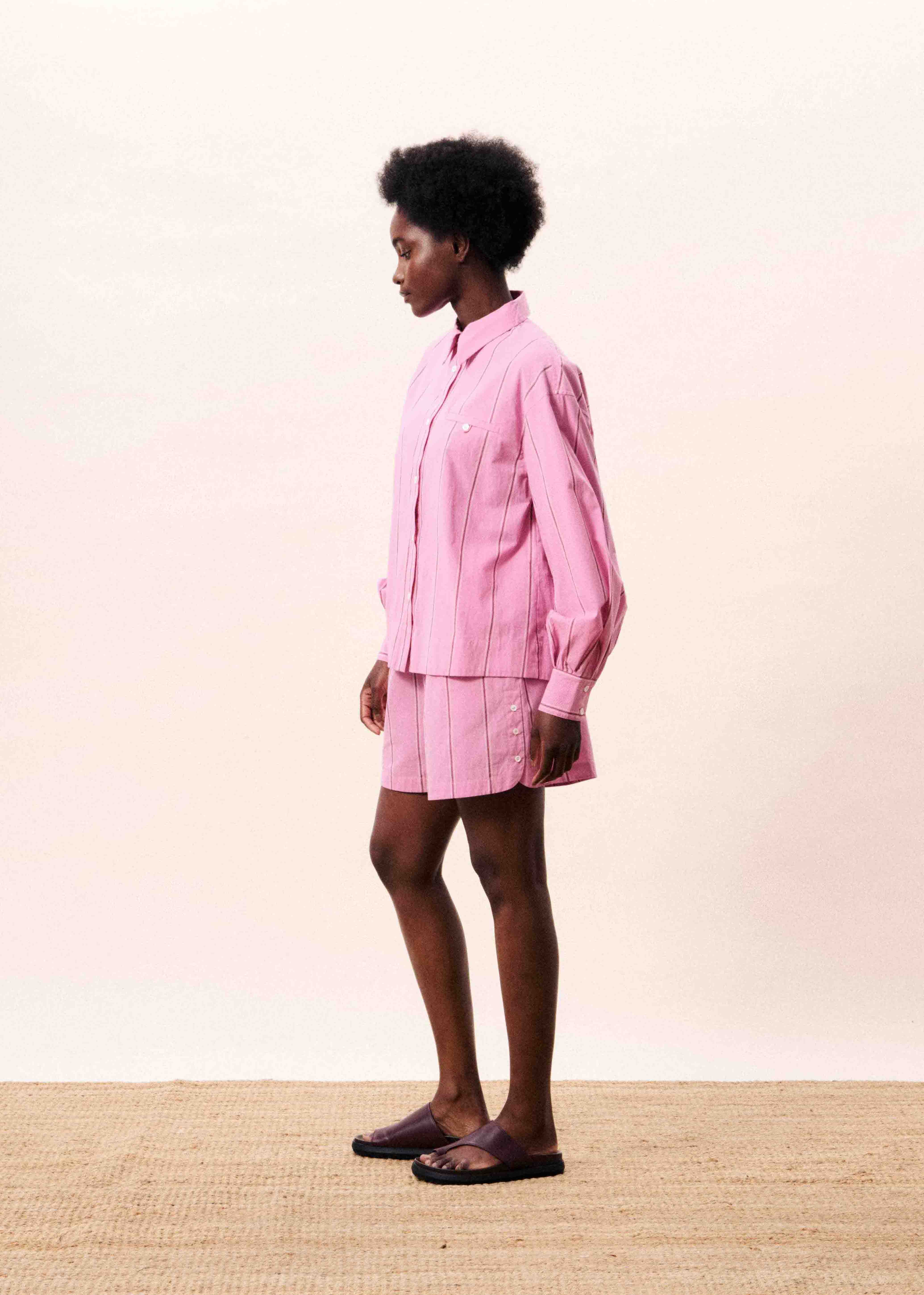 Oversized striped shirt with puff sleeves in pastel pink.