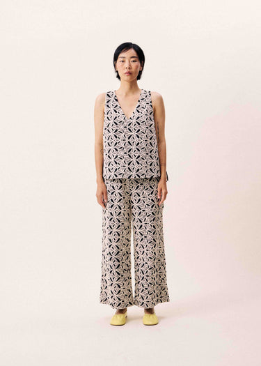 Wide-leg trousers with geometric patterns in black and white.