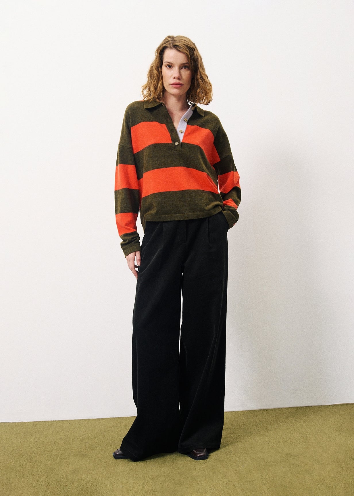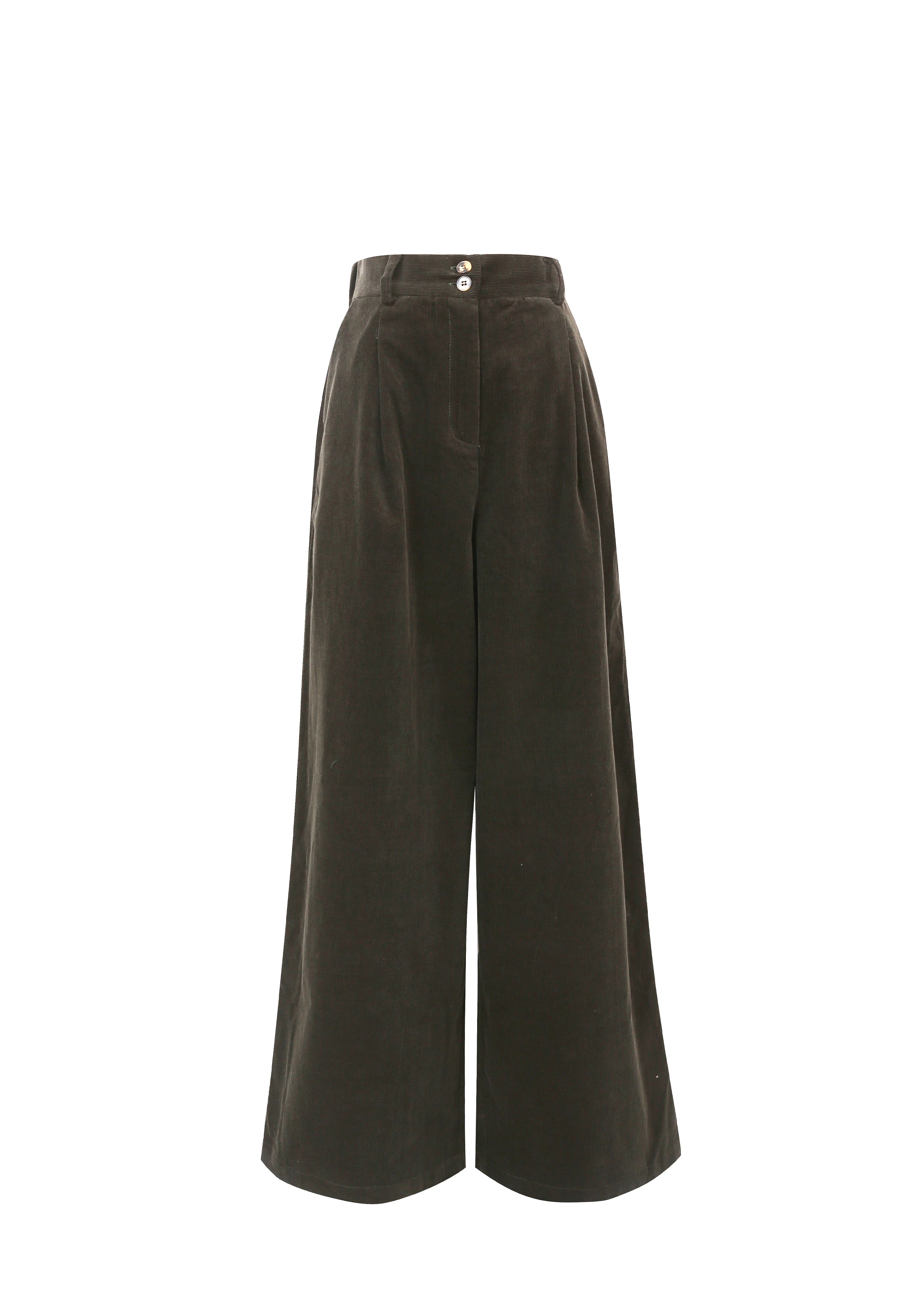 • Fine corduroy pants • Wide-leg cut • Pleats at the front • Two buttons on the belt