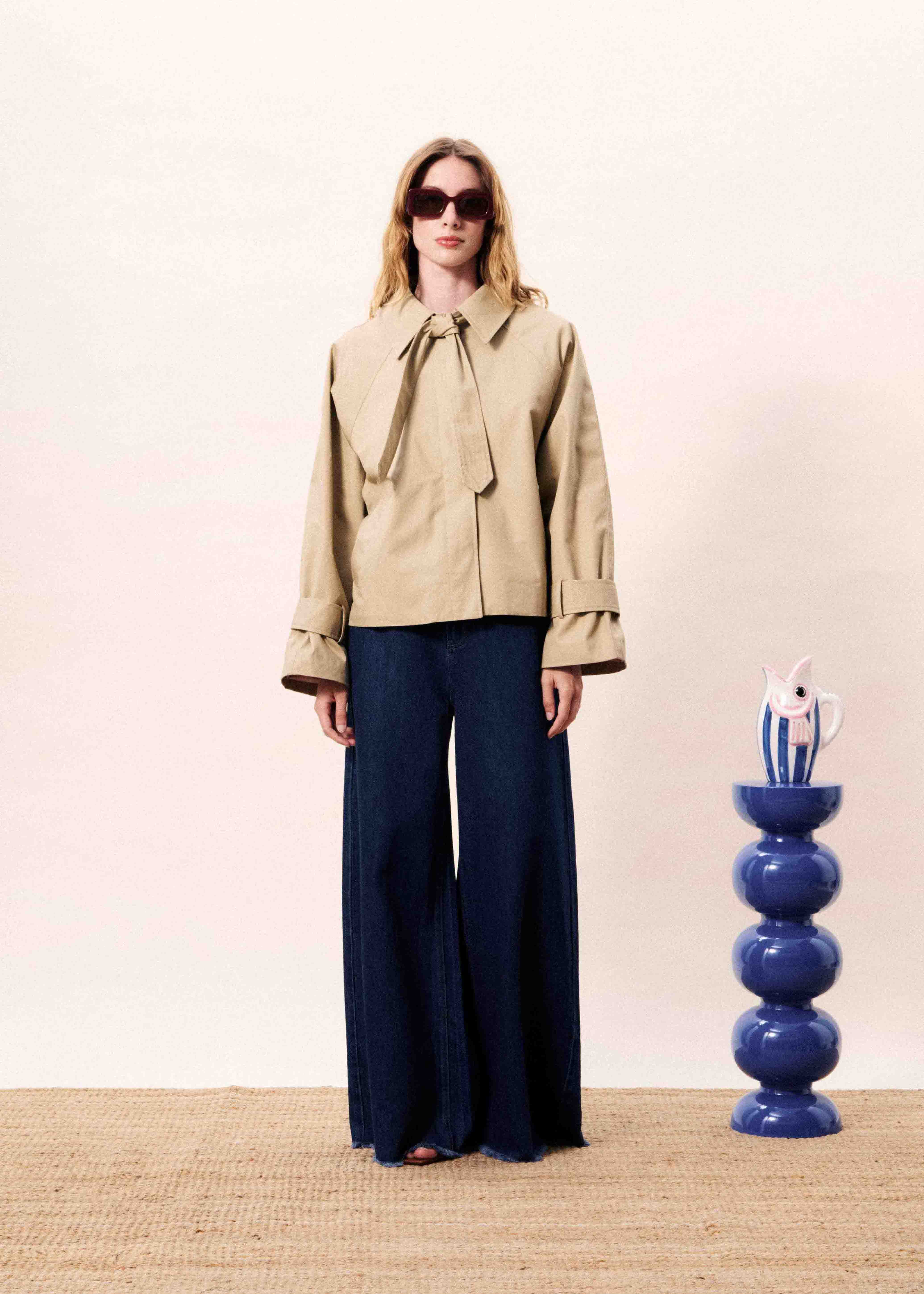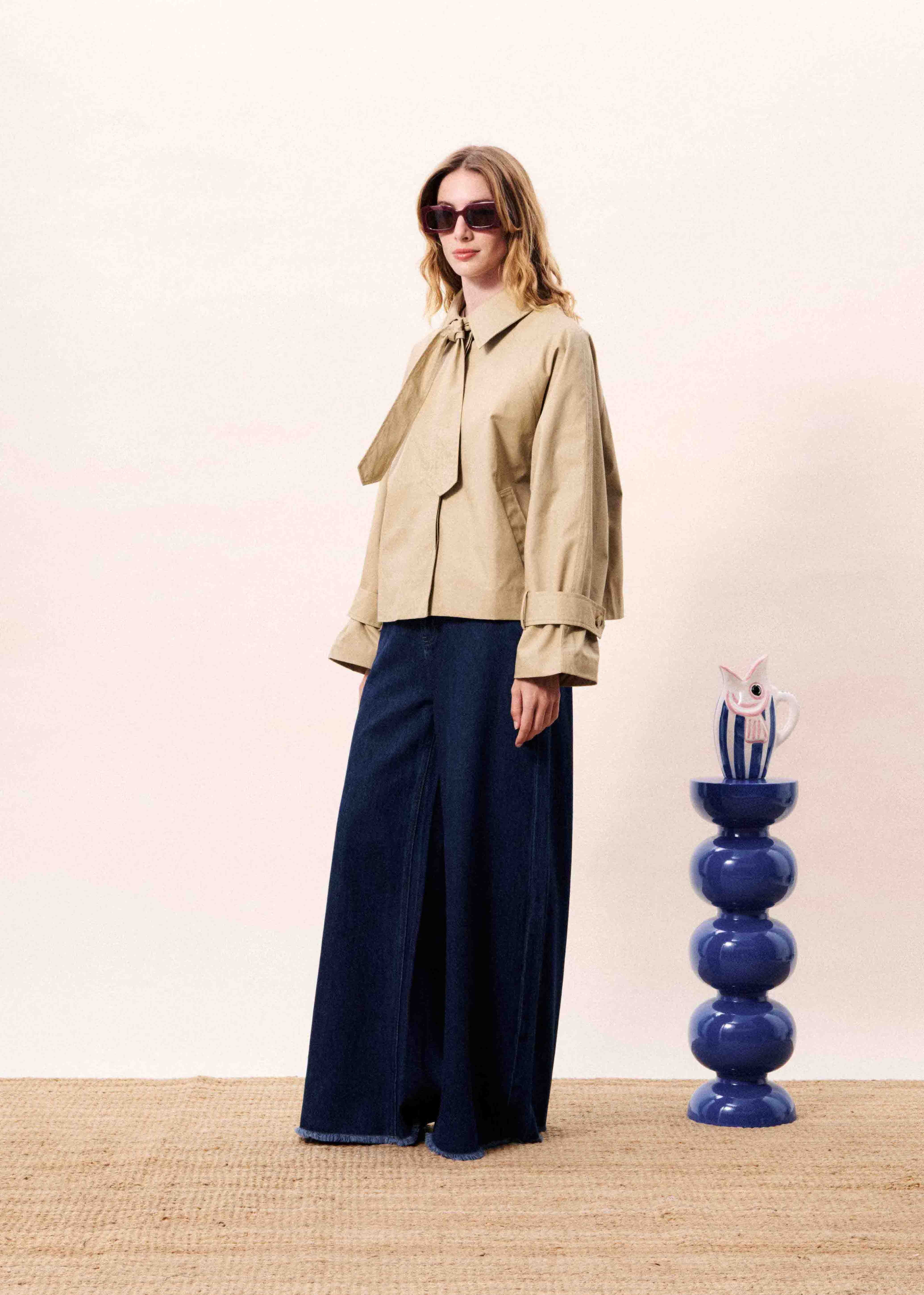 Short cotton jacket with shirt collar and tie closure.