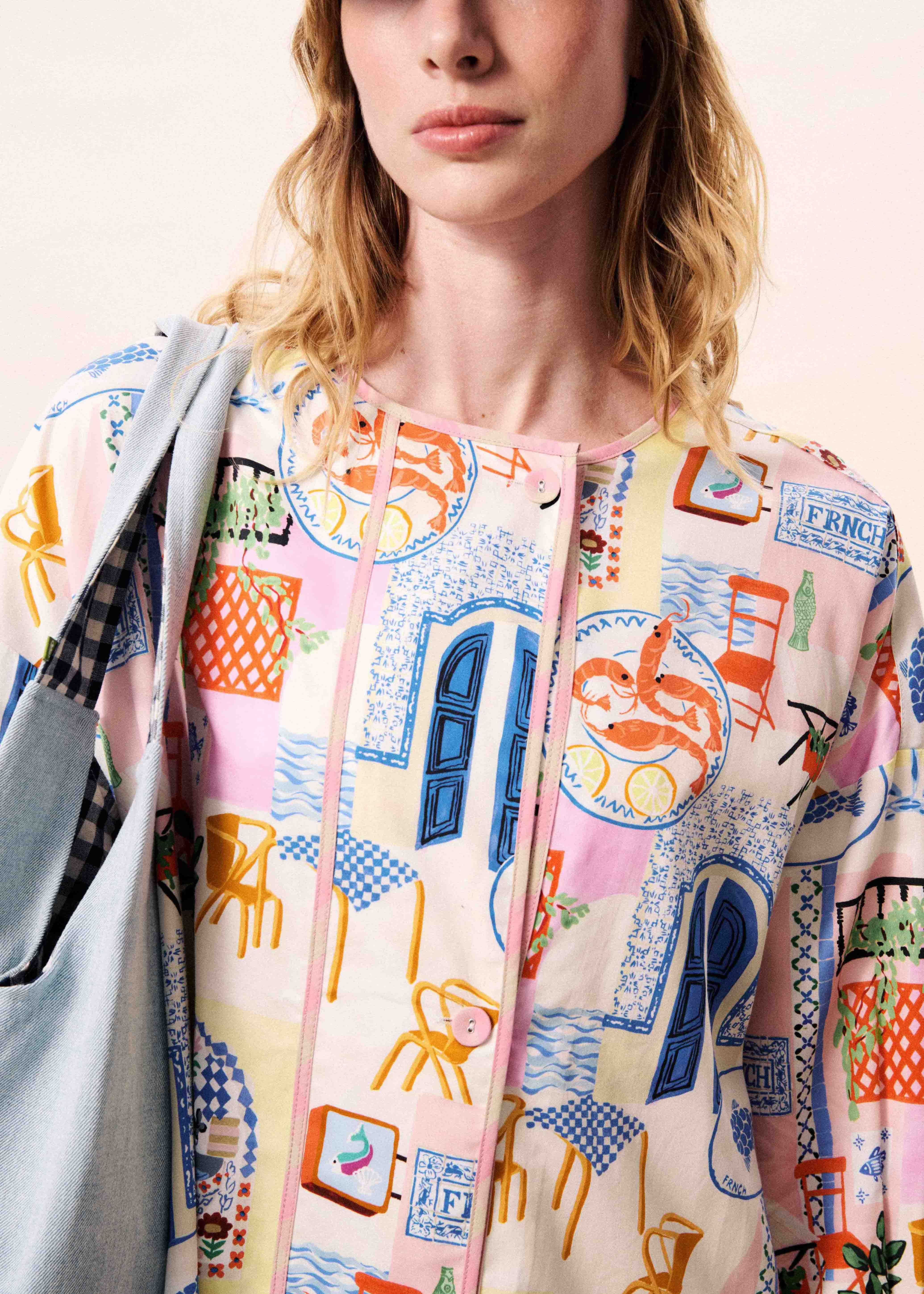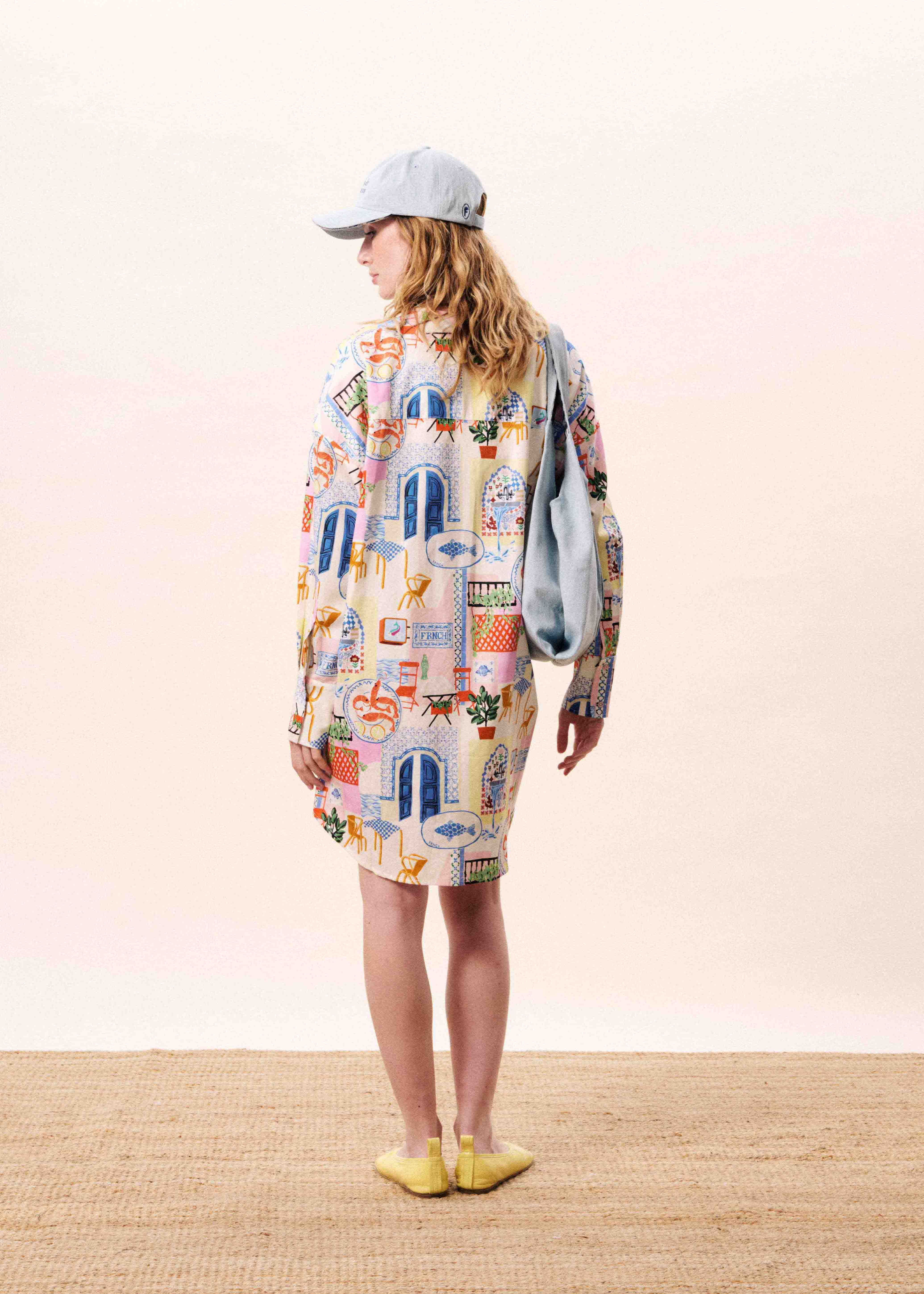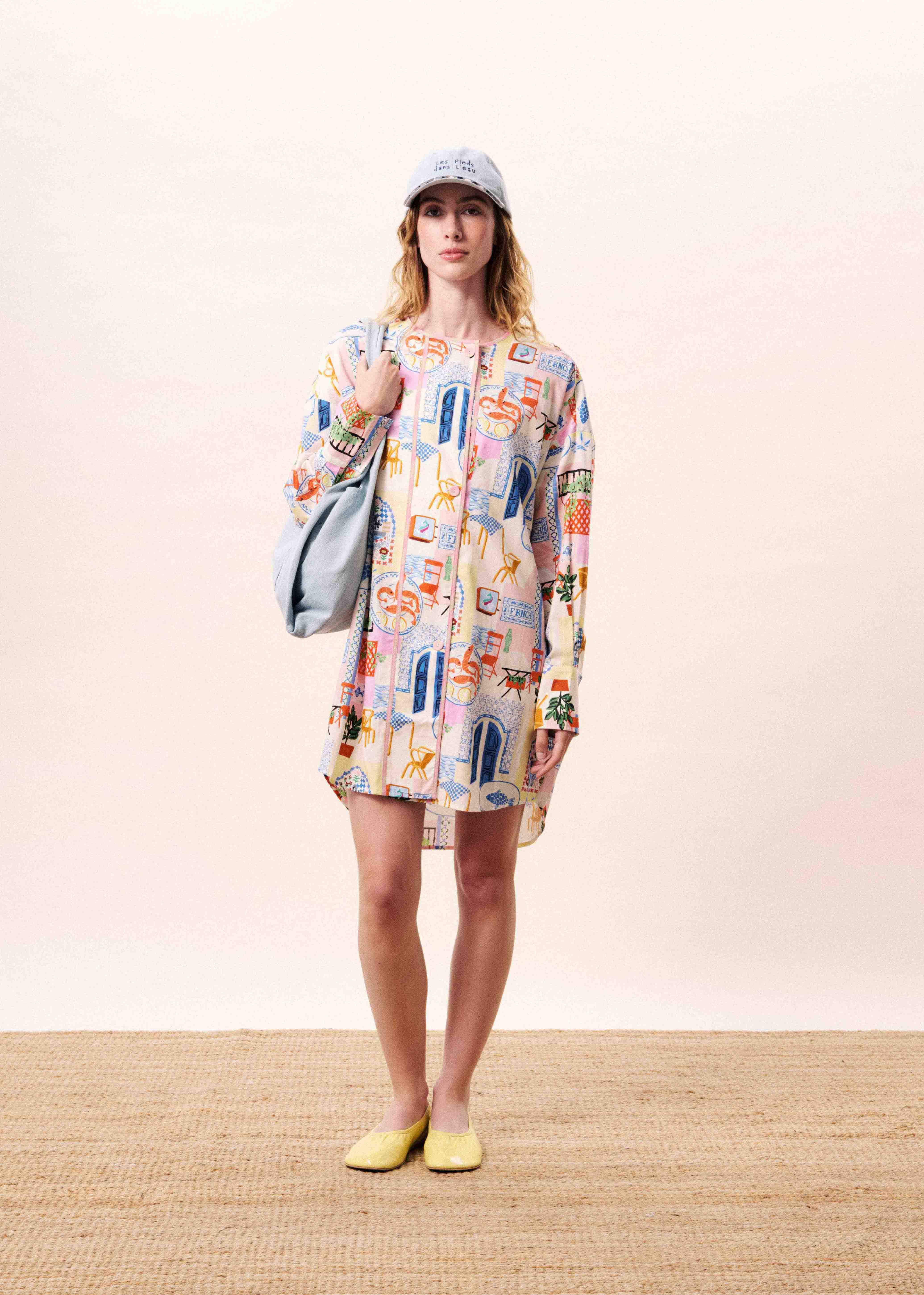 Robe droite à manches longues ornée d'un imprimé graphique multicolore évoquant l'univers de l'habitat.