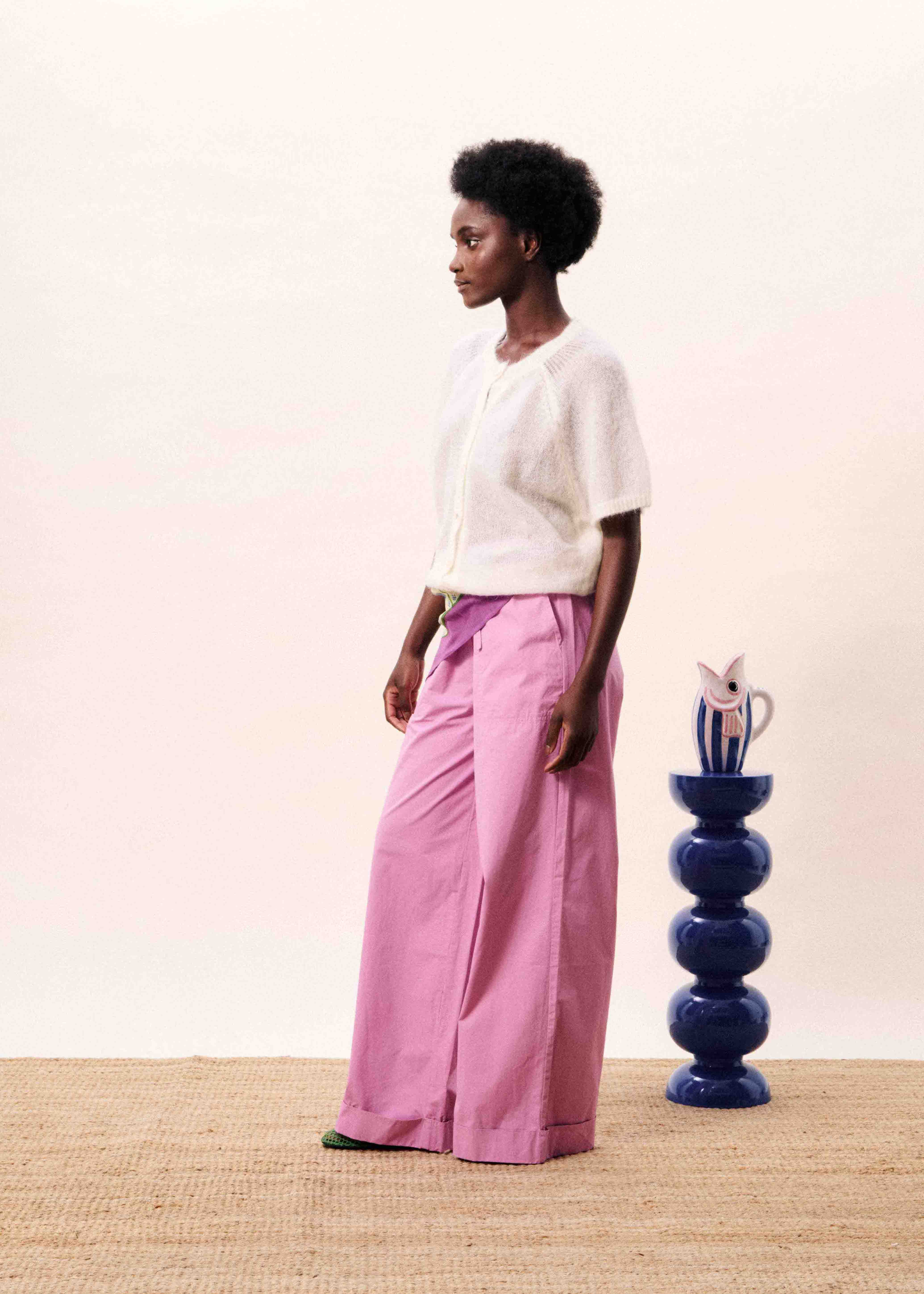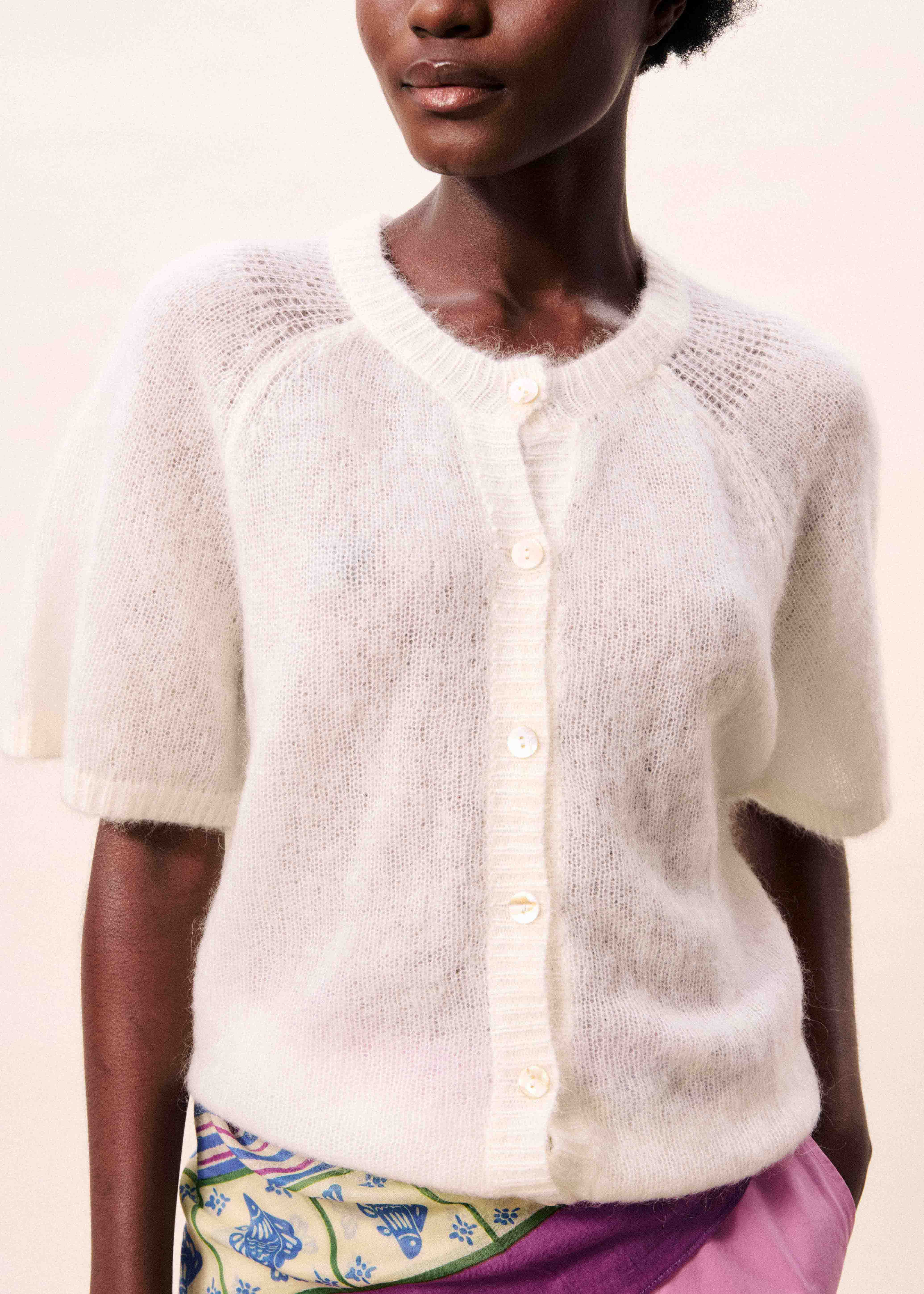 Cardigan court en maille fine avec boutonnage central, manches courtes et finition côtelée.
