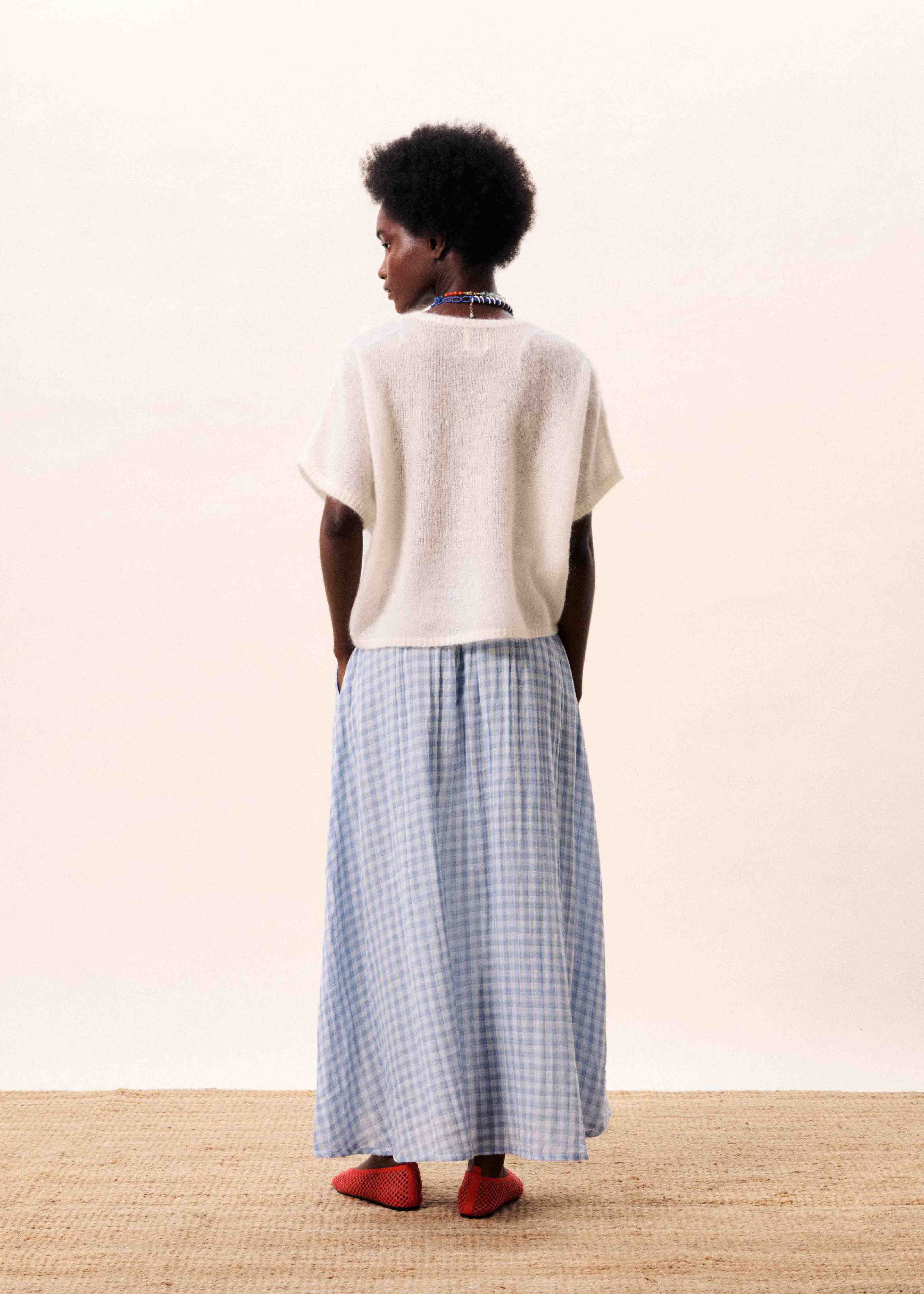 Jupe longue en coton à carreaux vichy bleu et blanc avec taille élastiquée.