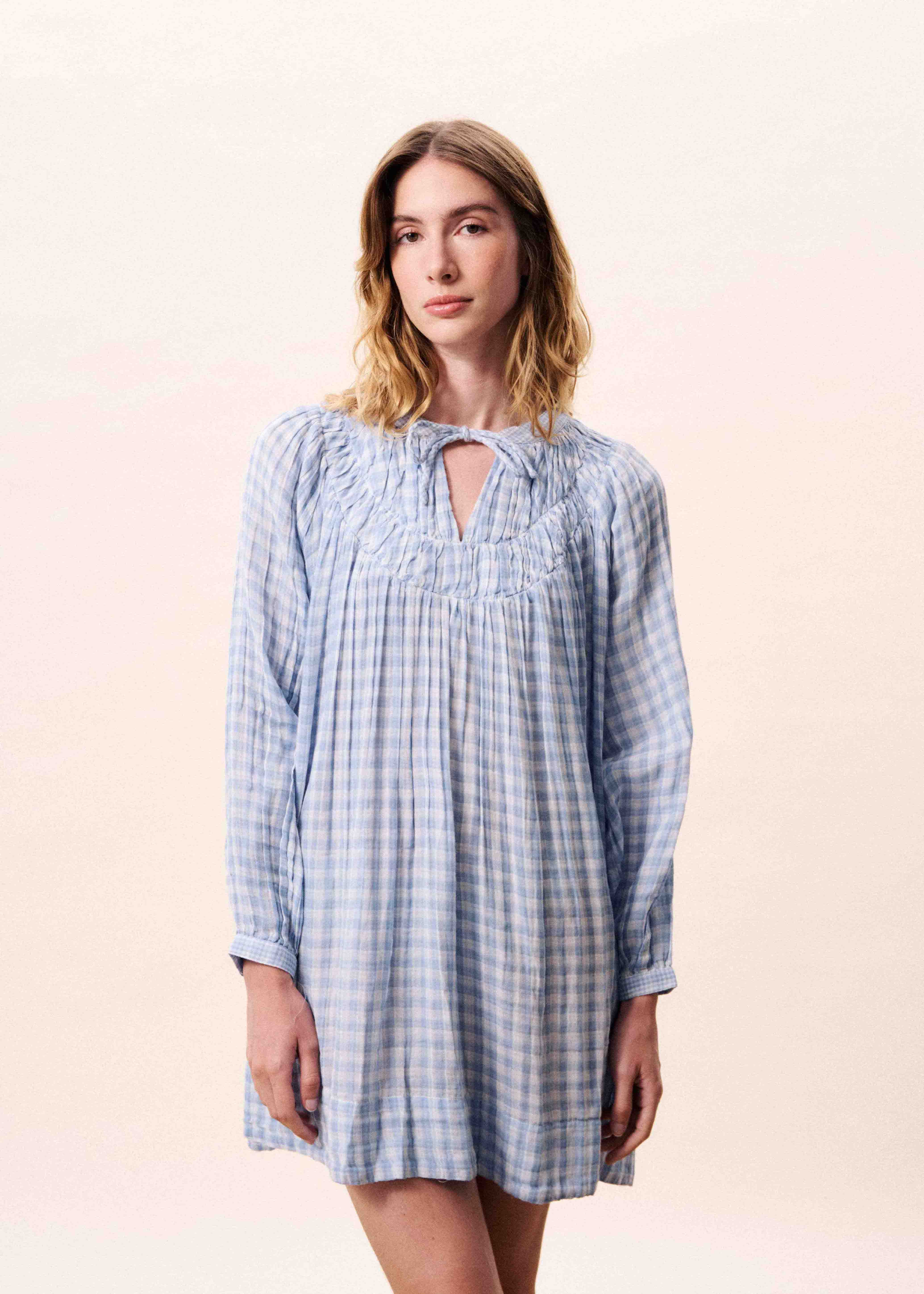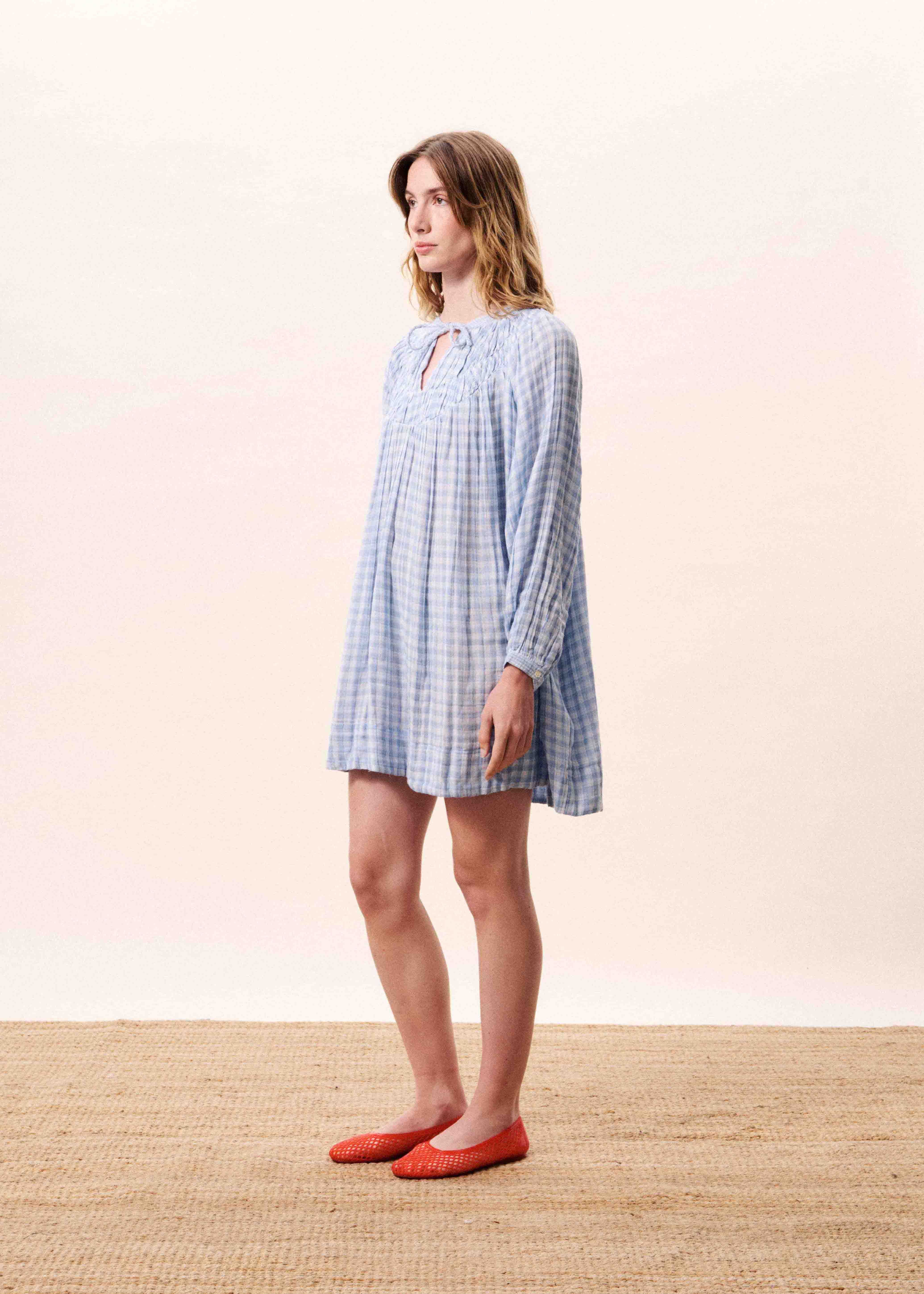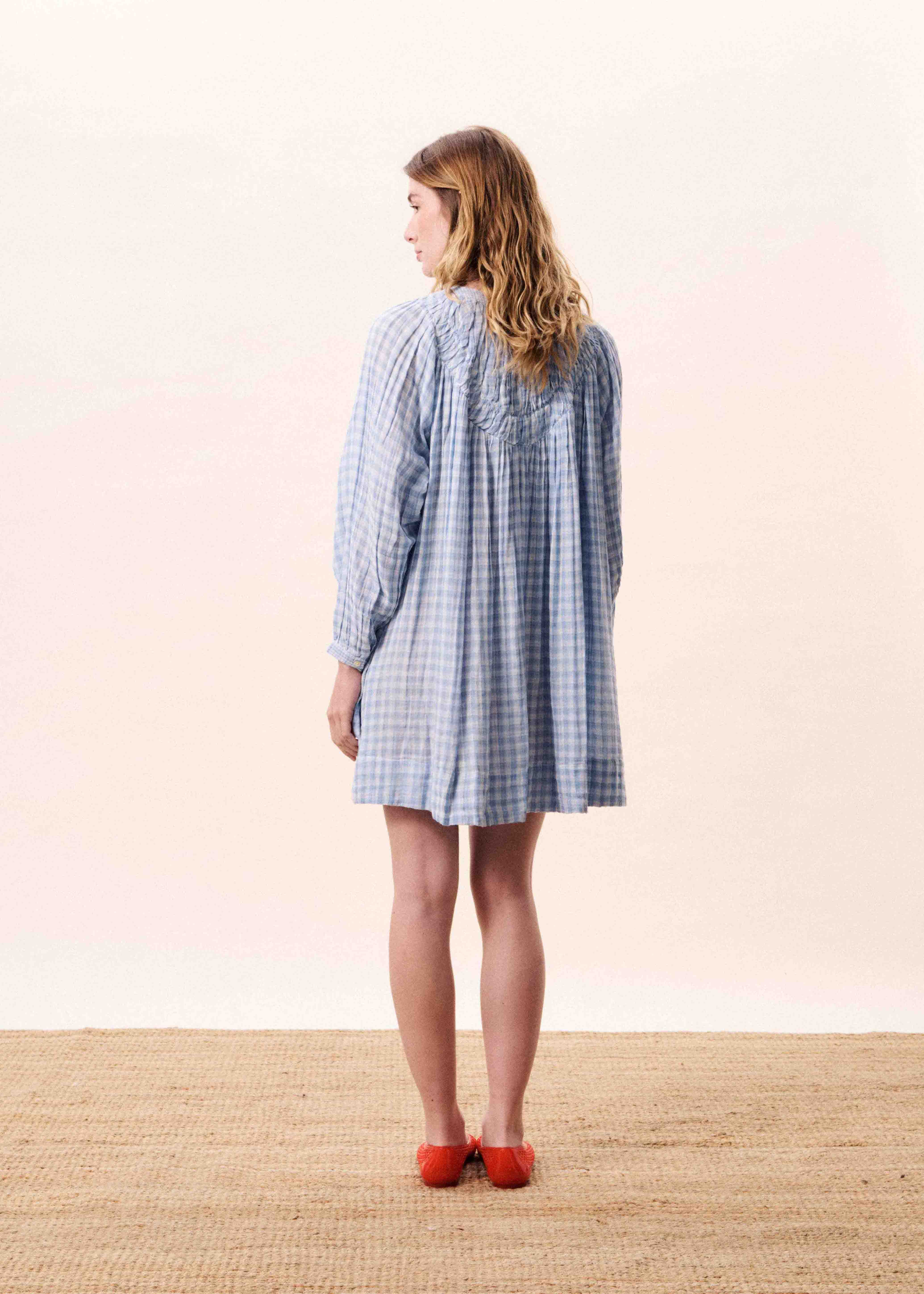Robe droite à carreaux vichy avec détails smockés au niveau de l'encolure.